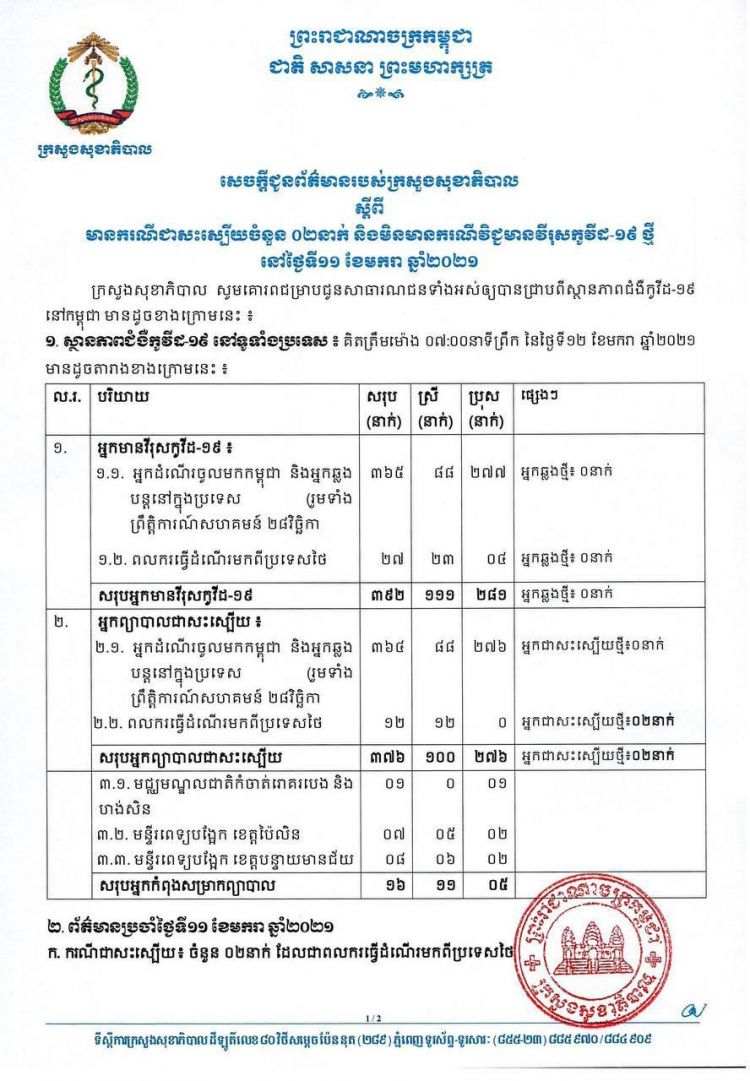 មិនមានករណីវិជ្ជមានកូវីដ-១៩ ថ្មីនោះទេ ខណៈមានការជាសះស្បើយចំនួន ០២នាក់ ដែលជាពលករមកពីប្រទេសថៃ
