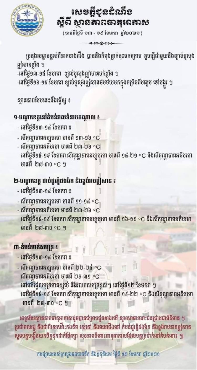 នៅតំបន់ខ្ពង់រាបឦសាន្ត និងជួរភ្នំដងរែក អាចនឹងចុះត្រជាក់ដល់ ១១អង្សារ ចាប់ពីថ្ងៃទី១៣ ដល់ថ្ងៃទី១៩ ខែមករា