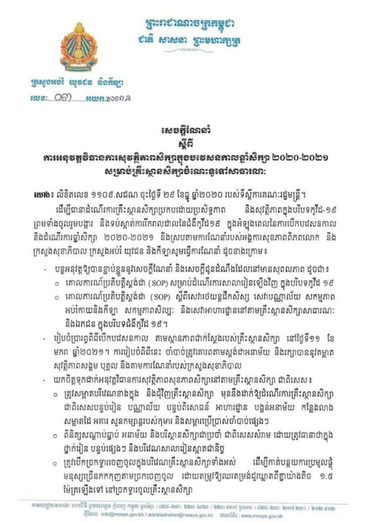 ក្រសួងអប់រំ យុវជន និងកីឡា ចេញសេចក្តីណែនាំ ស្តីពីការអនុវត្តវិធានការសុវត្ថិភាពក្នុងបវេសនកាល ឆ្នាំសិក្សា ២០២០-២០២១ សម្រាប់គ្រឹះស្ថានសិក្សាចំណេះទូទៅសាធារណៈ