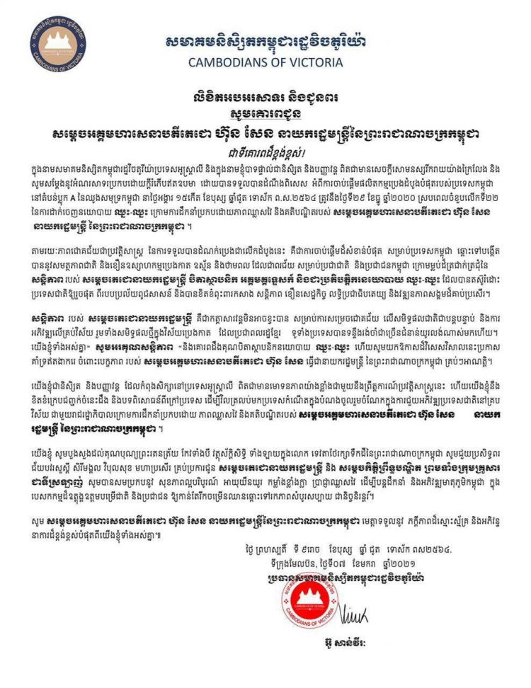 សមាគមនិស្សិតកម្ពុជារដ្ឋវិចតូរីយ៉ា ផ្ញើលិខិតអបអរសាទរ និងជូនពរ សម្តេចតេជោ ហ៊ុន សែន ក្នុងឱកាសនៃការទទួលបានដំណក់ប្រេងជាលើកដំបូង