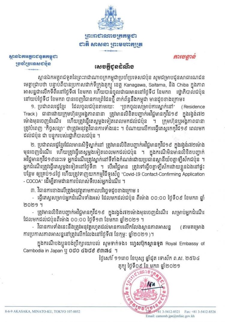 ស្ថានទូតកម្ពុជាប្រចាំប្រទេសជប៉ុន ជូនដំណឹងបន្ទាន់ ពាក់ព័ន្ធនឹងការដាក់ចេញវិធានការព្រំដែនថ្មីរបស់រដ្ឋាភិបាលជប៉ុន ពាក់ព័ន្ធនឹងកម្ពុជា