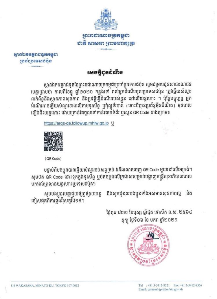 ស្ថានទូតកម្ពុជាប្រចាំប្រទេសជប៉ុន ជូនដំណឹងថា រាល់អ្នកដំណើរចូលប្រទេសជប៉ុន ត្រូវឆ្លើយសំណួរពាក់ព័ន្ធនឹងសុខភាព និងប្រវត្តិធ្វើដំណើររបស់ខ្លួន នៅលើយន្តហោះ