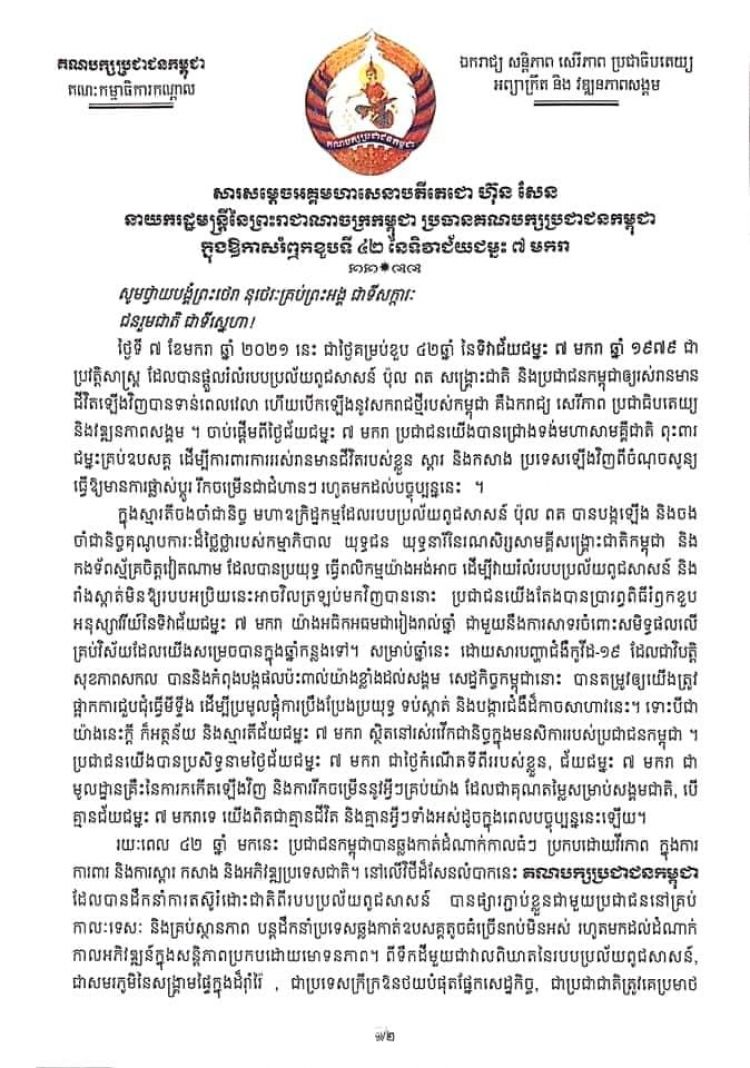 សារលិខិតរបស់ សម្តេចតេជោ ហ៊ុន សែន នាយករដ្ឋមន្ត្រី និងជា ប្រធានគណបក្សប្រជាជនកម្ពុជា ក្នុងឱកាសខួបទី៤២ឆ្នាំ ទិវាជ័យជម្នះ ៧មករា
