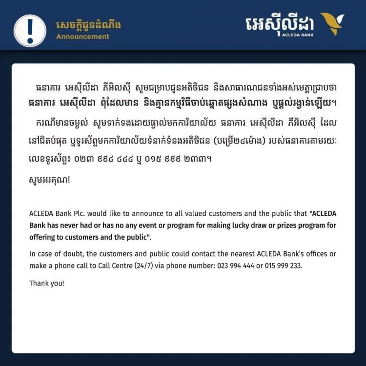 ធនាគារអាស៊ីលីដា (ACLEDA) បញ្ជាក់ថា ធនាគារពុំដែលមាន និងគ្មានកម្មវិធីចាប់ឆ្នោតផ្សងសំណាង ឬផ្តល់រង្វាន់ឡើយ