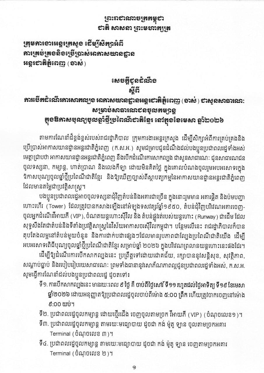 សេចក្តីជូនដំណឹង ស្តីពីការបើកដំណើរការសាកល្បង អាកាសយានដ្ឋានអន្តរជាតិភ្នំពេញ (ចាស់) ជាសួនសាធារណៈសម្រាប់សាធារណជនចូលកម្សាន្ត ក្នុងឱកាសបុណ្យចូលឆ្នាំថ្មីប្រពៃណីជាតិខ្មែរ