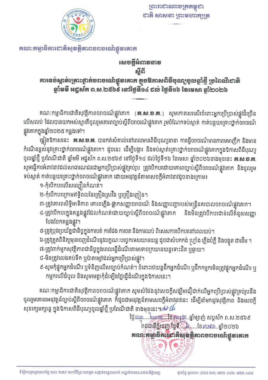 គណៈកម្មាធិការជាតិសុវត្ថិភាពចរាចរណ៍ផ្លូវគោក ចេញសេចក្ដីអំពាវនាវស្ដីពីការទប់ស្កាត់គ្រោះថ្នាក់ចរាចរណ៍ផ្លូវគោក ក្នុងឱកាសពិធីបុណ្យចូលឆ្នាំថ្មីប្រពៃណីជាតិខ្មែរ នាពេលខាងមុខ
