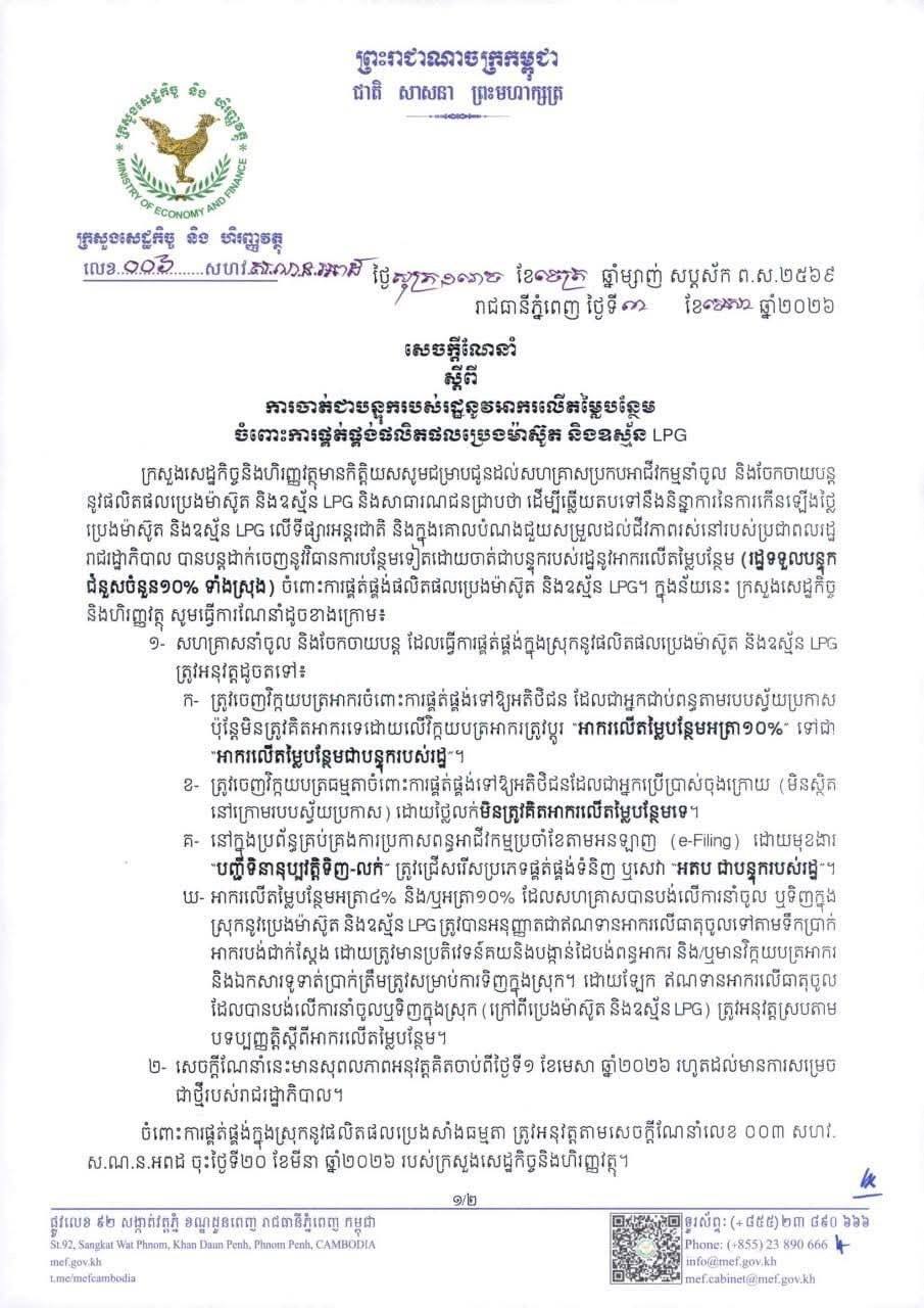 រាជរដ្ឋាភិបាល សម្រេចចាត់ជាបន្ទុករបស់រដ្ឋ ចំពោះអាករលើតម្លៃបន្ថែម (VAT) នៃការផ្គត់ផ្គង់ផលិតផលប្រេងម៉ាស៊ូត និងឧស្ម័ន LPG