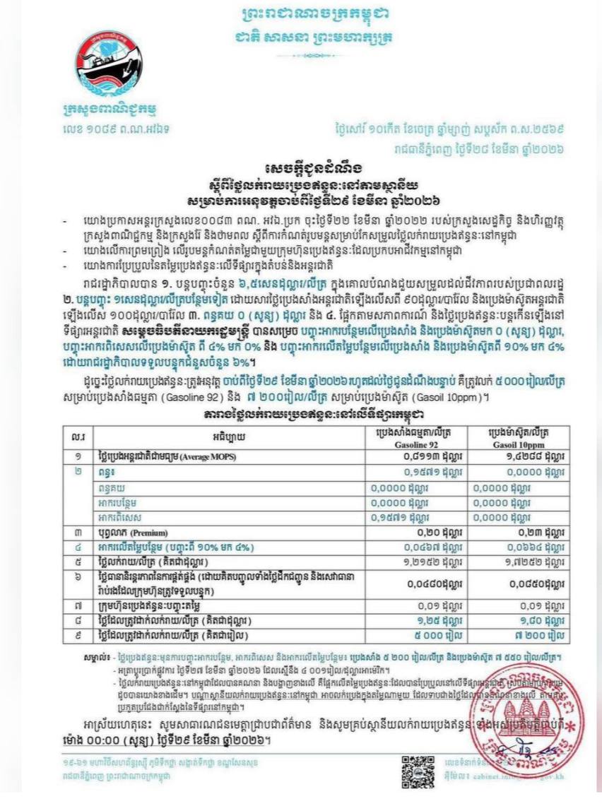 តម្លៃប្រេងសាំង ៥.០០០រៀល/លីត្រ ខណៈប្រេងម៉ាស៊ូត ៧.២០០រៀល/លីត្រ សម្រាប់លក់លើទីផ្សារចាប់ពីថ្ងៃទី២៩ ខែមីនា រហូតដល់ថ្ងៃជូនដំណឹងបន្ទាប់