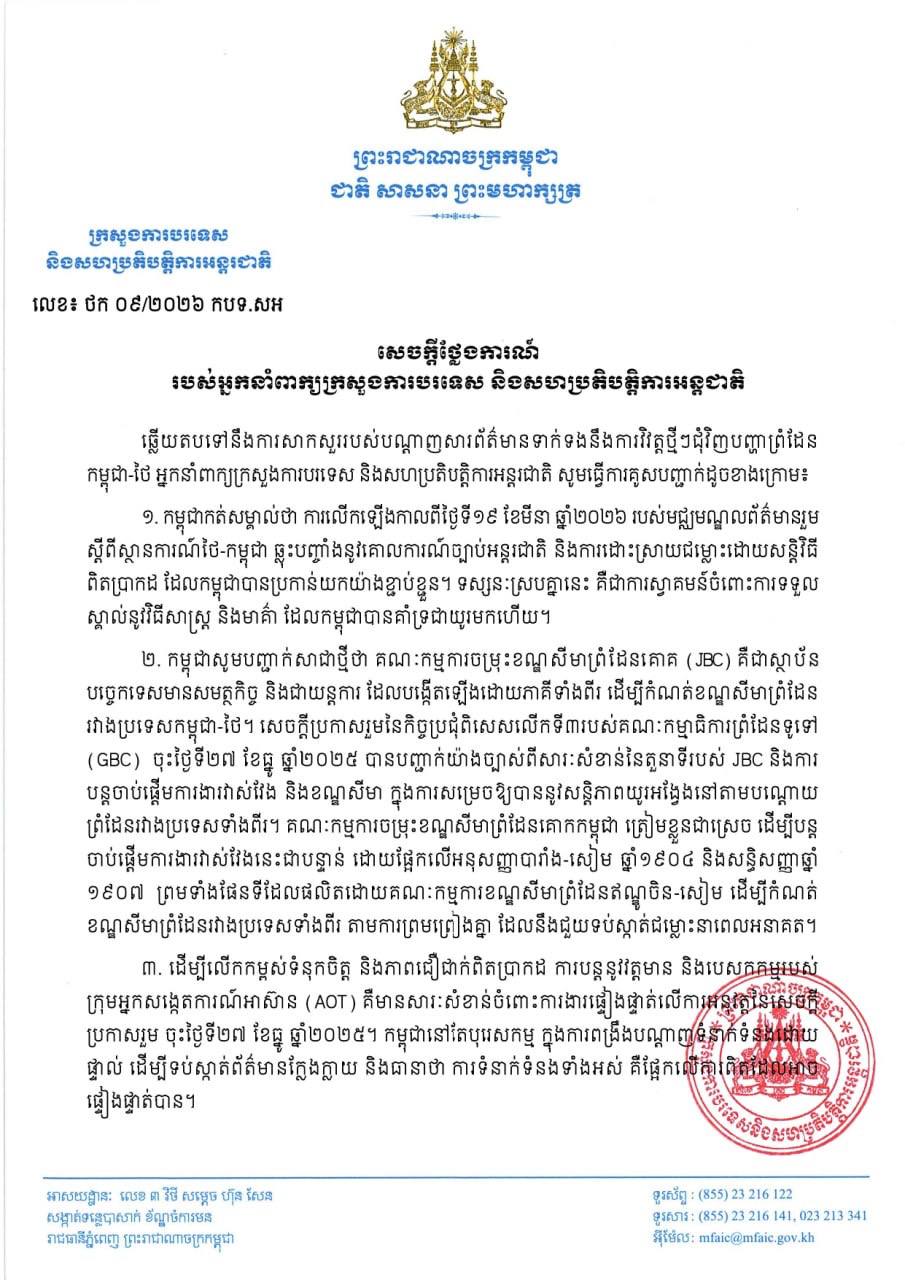 សេចក្តីថ្លែងការណ៍ របស់ក្រសួងការបរទេស ទាក់ទងនឹងការវិវត្តថ្មីៗជុំវិញបញ្ហា កម្ពុជា-ថៃ