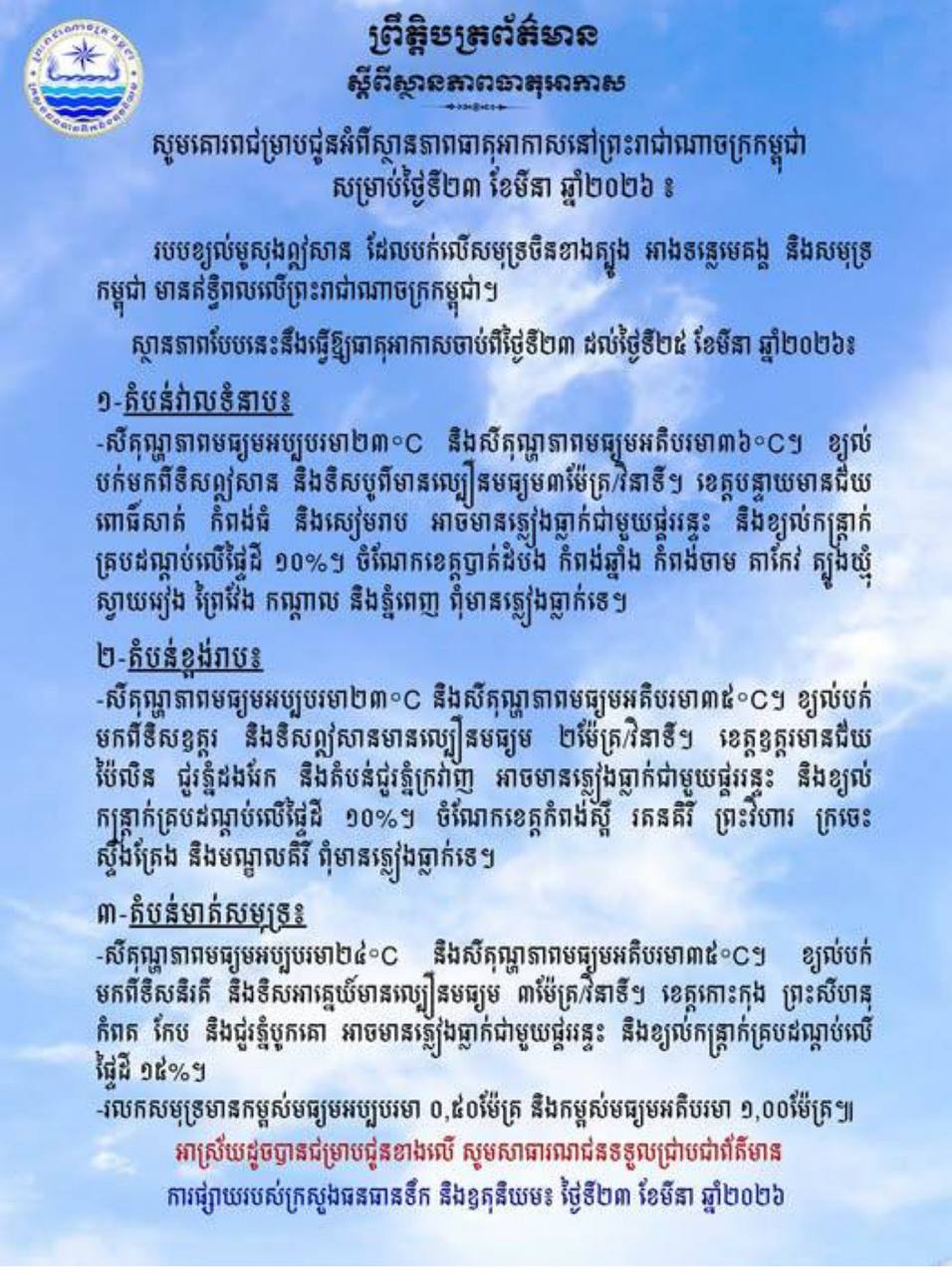 អាកាសធាតុអាចមានភ្លៀងធ្លាក់ជាមួយផ្គររន្ទះ និងខ្យល់កន្ត្រាក់គ្របដណ្តប់លើផ្ទៃដី១៥ភាគរយ រយៈពេល៣ថ្ងៃ