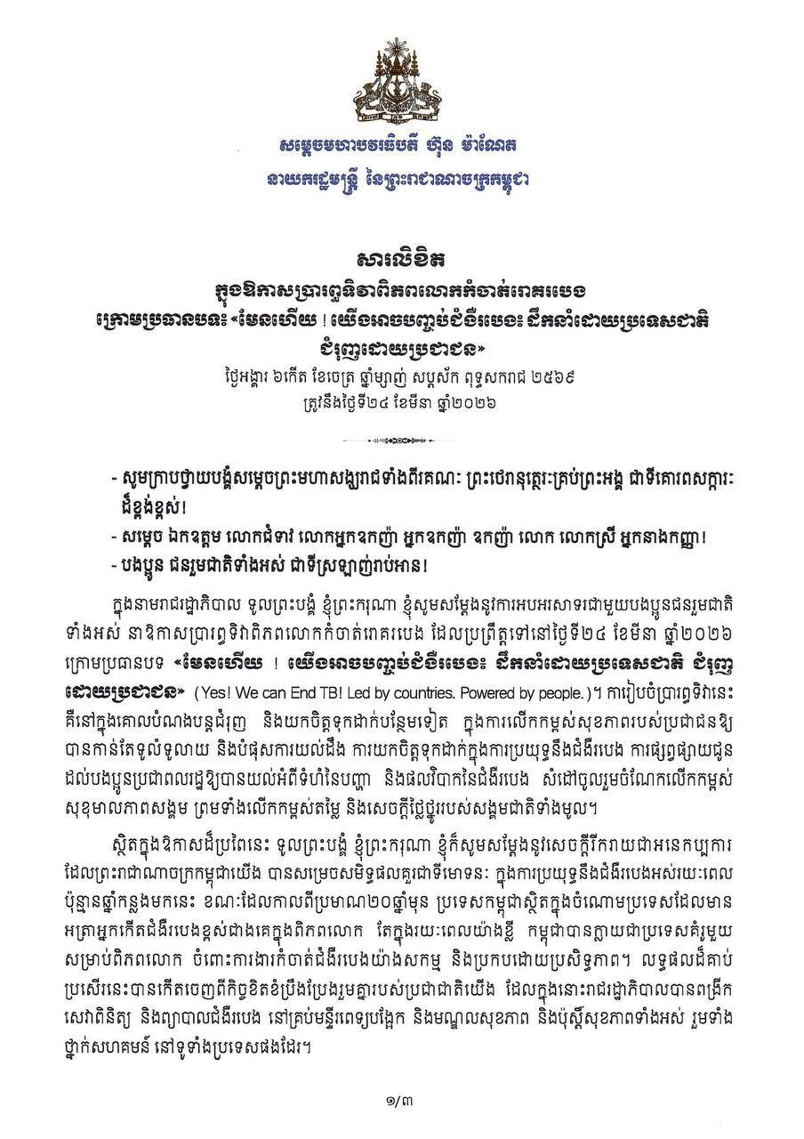 សារលិខិត របស់ សម្តេចធិបតីនាយករដ្ឋមន្ត្រី ក្នុងឱកាសប្រារព្ធទិវាពិភពលោកកំចាត់រោគរបេង ២៤ មីនា ២០២៦