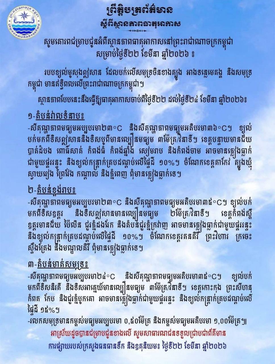 ស្ថានភាពអាកាសធាតុនៅកម្ពុជា ថ្ងៃទី២២ ខែមីនា ២០២៦ អាចមានភ្លៀងធ្លាក់ ជាមួយខ្យល់កន្ត្រាក់ ផ្គររន្ទះគ្របដណ្តប់លើផ្ទៃដី១៥ភាគរយ
