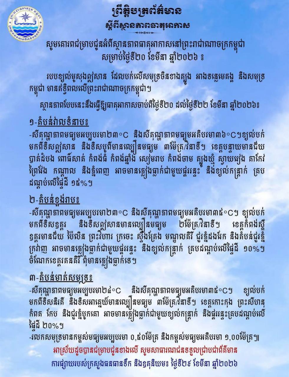 ធាតុអាកាស ៣ថ្ងៃអាចរងឥទ្ធិពលភ្លៀងធ្លាក់ជាមួយខ្យល់កន្ត្រាក់ និងផ្គររន្ទះគ្របដណ្តប់លើផ្ទៃដី ២០ភាគរយ