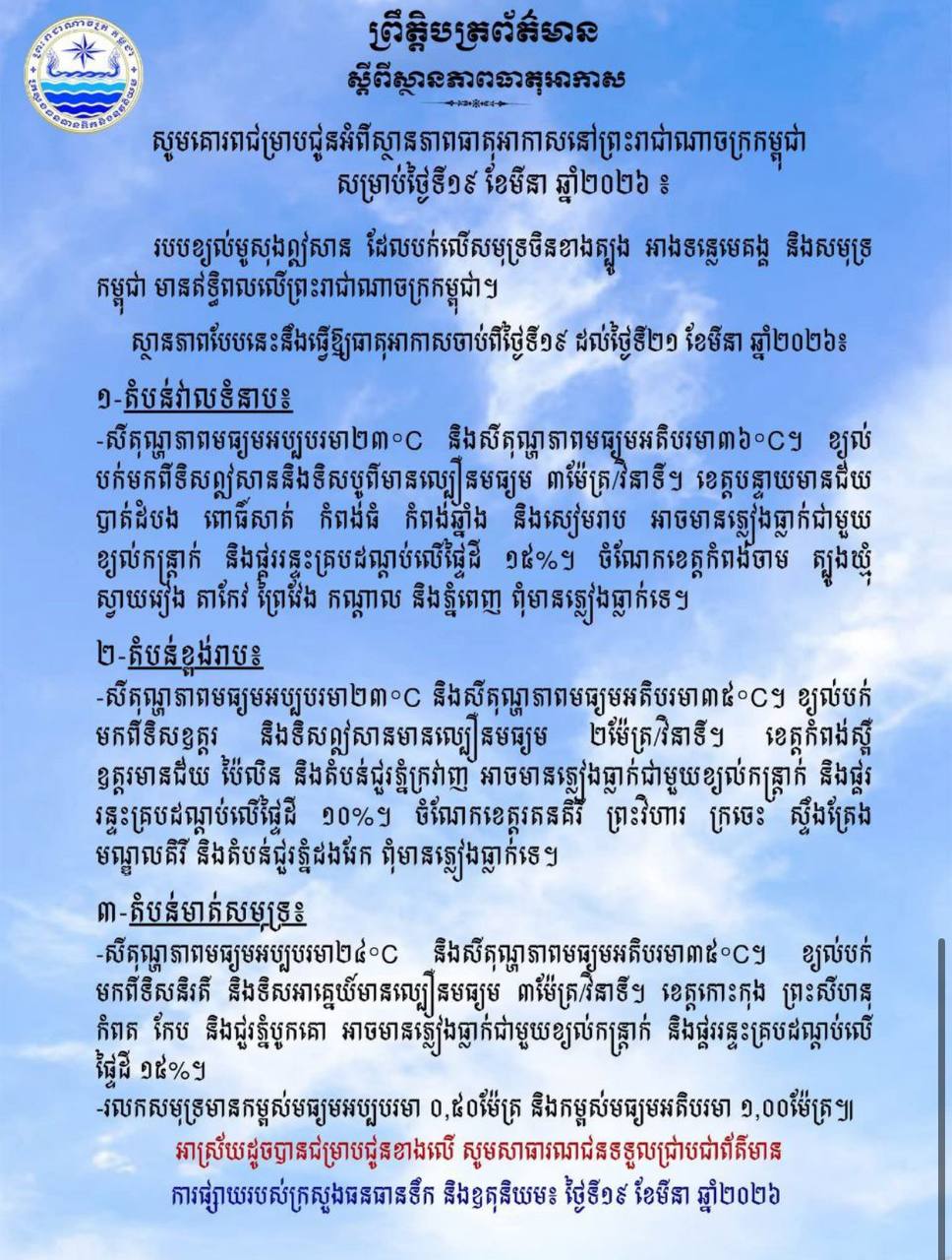 ធាតុអាកាស៣ថ្ងៃ អាចនឹងមានភ្លៀងធ្លាក់ជាមួយខ្យល់កន្ត្រាក់ផ្គររន្ទះគ្របដណ្តប់លើផ្ទៃដី១៥ភាគរយ នៅទូទាំងព្រះរាជាណាចក្រកម្ពុជា