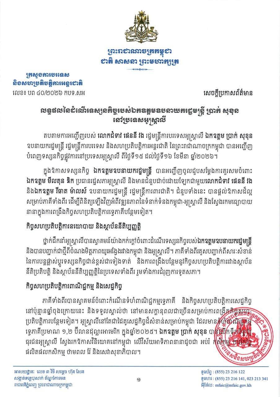 លទ្ធផលនៃដំណើរទស្សនកិច្ចរបស់ឯកឧត្តមឧបនាយករដ្ឋមន្ត្រី ប្រាក់ សុខុន នៅប្រទេសអូស្ត្រាលី