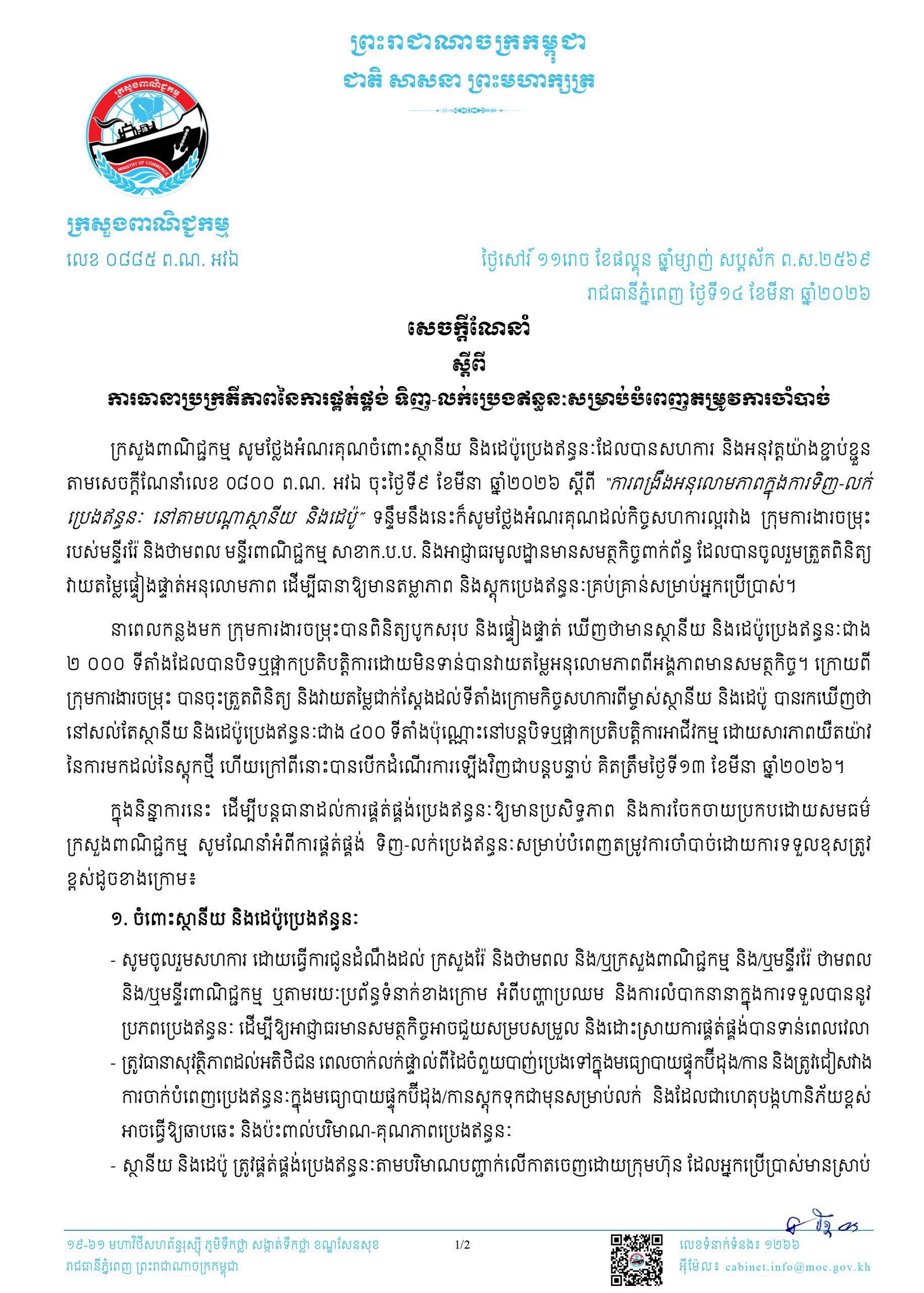 សេចក្តីណែនាំ ស្តីពីការធានាប្រក្រតីភាពនៃការផ្គត់ផ្គង់ ទិញ-លក់ប្រេងឥន្ធនៈសម្រាប់បំពេញតម្រូវការចាំបាច់