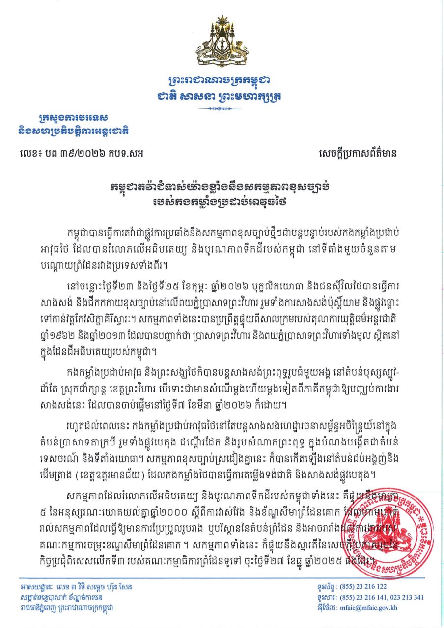 សេចក្តីប្រកាសព័ត៌មាន ស្តីពី កម្ពុជាតវ៉ាជំទាស់យ៉ាងខ្លាំងនឹងសកម្មភាពខុសច្បាប់ របស់កងកម្លាំងប្រដាប់អាវុធថៃ