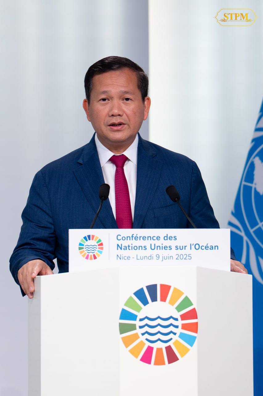 AKP Nice, June 09, 2025 — Cambodia’s Prime Minister Samdech Moha Borvor Thipadei Hun Manet (Pic. 1) delivers the National Statement at the Third United Nations Ocean Conference (UNOC3) in Nice, France this afternoon (Nice time).Photo: Facebook Page of Sa...