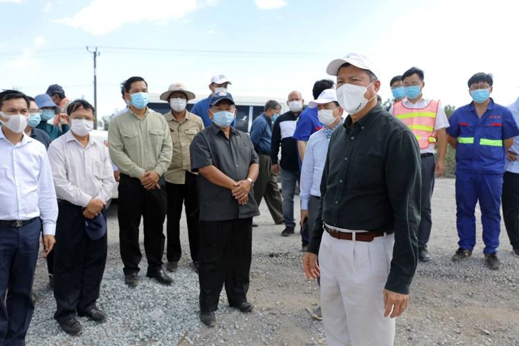 AKP Kampot, January 04, 2021— Senior Minister and Minister of Public Works and Transport H.E. Sun Chanthol (R, Pic. 1), accompanied by expert officials, local authorities and representatives of construction companies, pays an inspection visit to the construction sites of National Road No. 3 project and international t...