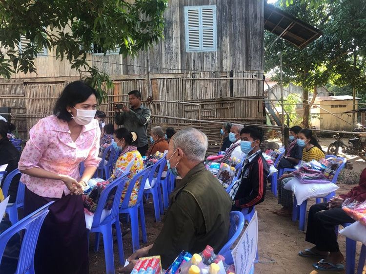 AKP Kampong Cham, January 08, 2021 -- Lok Chumteav Khieu Tep Rainsy Kanharith (L, Pic. 1), Honorary President of Cambodian Women for Peace and Development Association at the Ministry of Information, speaks to a local resident while she and her colleagues were visiting and distributing donations to 90 needy familie...