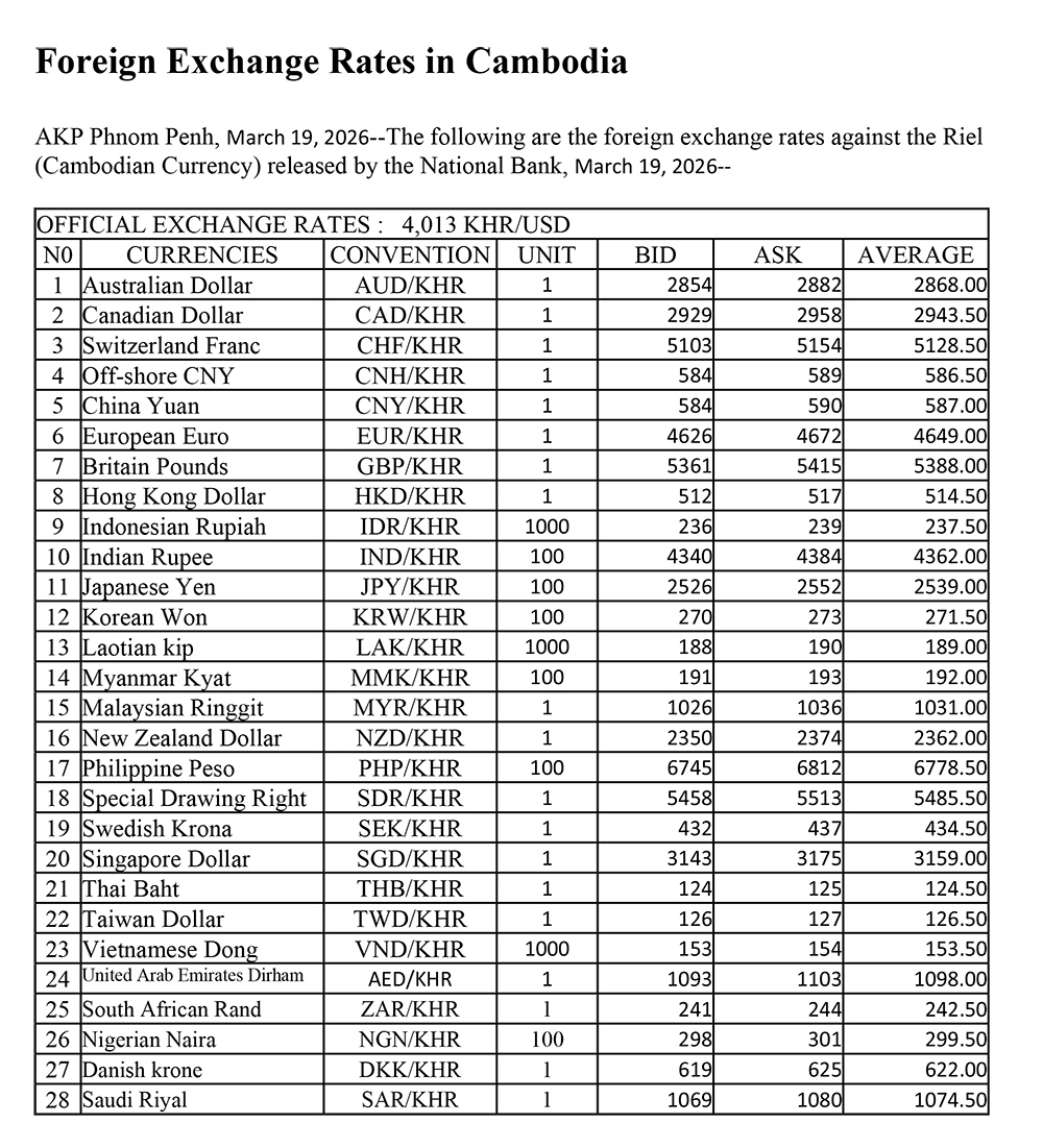 AKP Phnom Penh, March 19, 2026--The following are the foreign exchange rates against the Riel (Cambodian Currency) released by the National Bank, March 19, 2026--