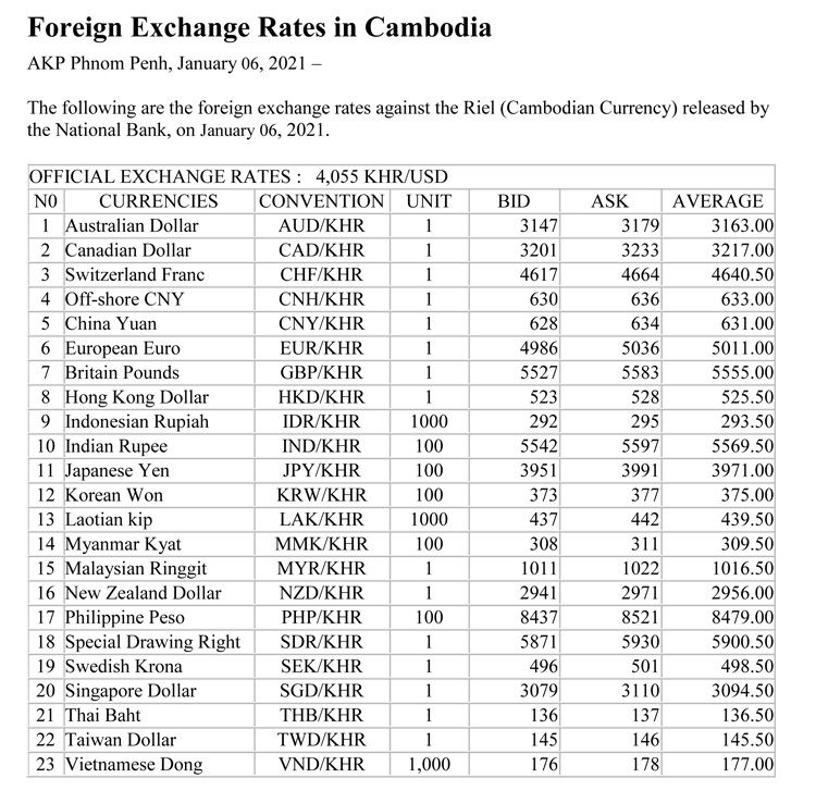 AKP Phnom Penh, January 06, 2021 – The following are the foreign exchange rates against the Riel (Cambodian Currency) released by the National Bank, on January 06, 2021.