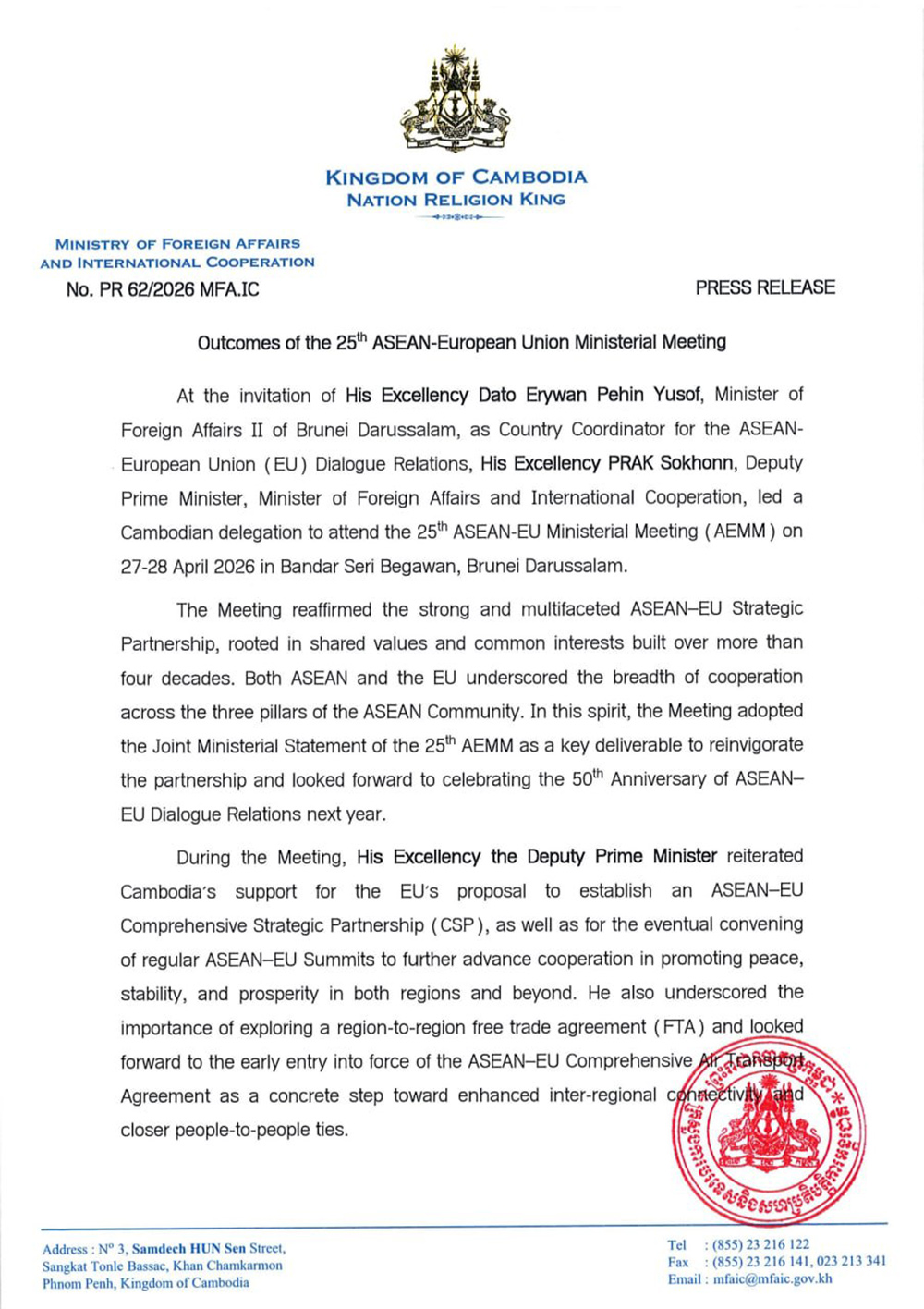 Outcomes of 25th ASEAN-European Union Ministerial Meeting