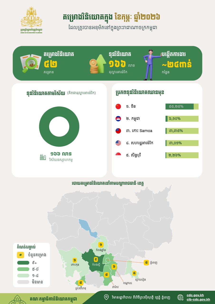 Phnom Penh, March 11, 2026 -- A total of 42 investment projects with a combined capital of about US$166 million were registered in Cambodia in February 2026, according to a press release released on Wednesday evening by the Council for the Development of Cambodia (CDC). The projects are...