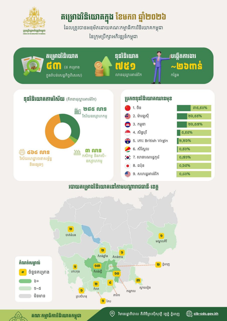 AKP Phnom Penh, February 10, 2026 -- Cambodia approved 43 fixed-asset investment projects in January 2026, with a total investment capital of US$752 million, generating 26,000 jobs for the locals, according to a report released on Feb. 10 by the Council for the Development of Cambodia (CDC). The...