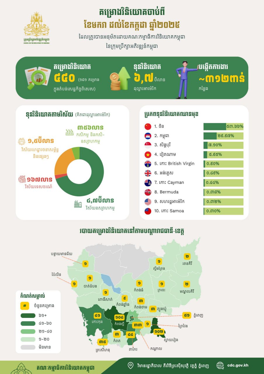 AKP Phnom Penh, August 12, 2025 -- The Council for the Development of Cambodia (CDC) has approved a total of 440 Qualified Investment Projects (QIPs) worth approximately US$6.7 billion during the first seven months of 2025, marking an increase of 206 projects and about US$3 billion compared to the s...