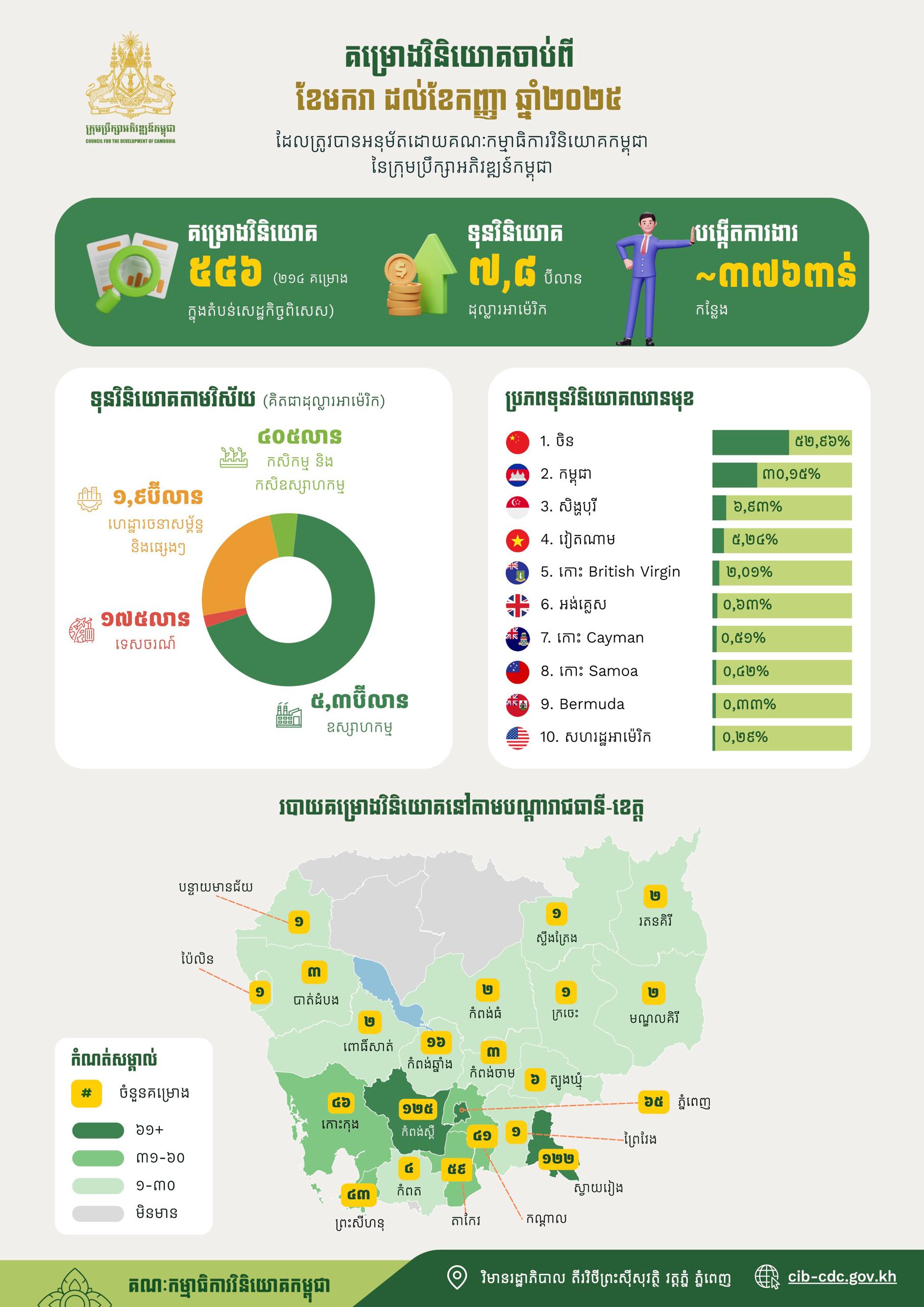 AKP Phnom Penh, October 02, 2025 -- In the first three quarters of this year, the Cambodian Investment Board of the Council for the Development of Cambodia (CDC) approved 546 investment projects, a surge of 73 percent compared to the same period last year. According to a press release issued t...