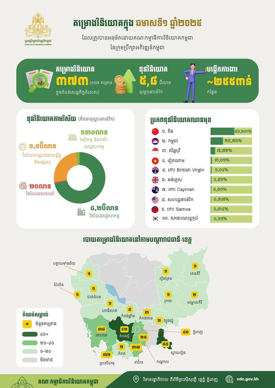 AKP Phnom Penh, July 07, 2025 -- Cambodia approved a total of 373 investment projects in the first half of 2025, representing a 96 percent increase compared to 190 projects during the same period last year, according to a report released today by the Council for the Development of Cambodia (CDC)....