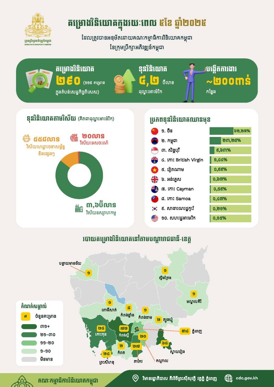 AKP Phnom Penh, June 10, 2025 -- The number of newly registered investment projects in Cambodia rose sharply by 90 percent year-on-year to 290 in the first five months of 2025, while total registered capital increased by 52 percent to US$4.2 billion, according to a press release issued by the Cou...