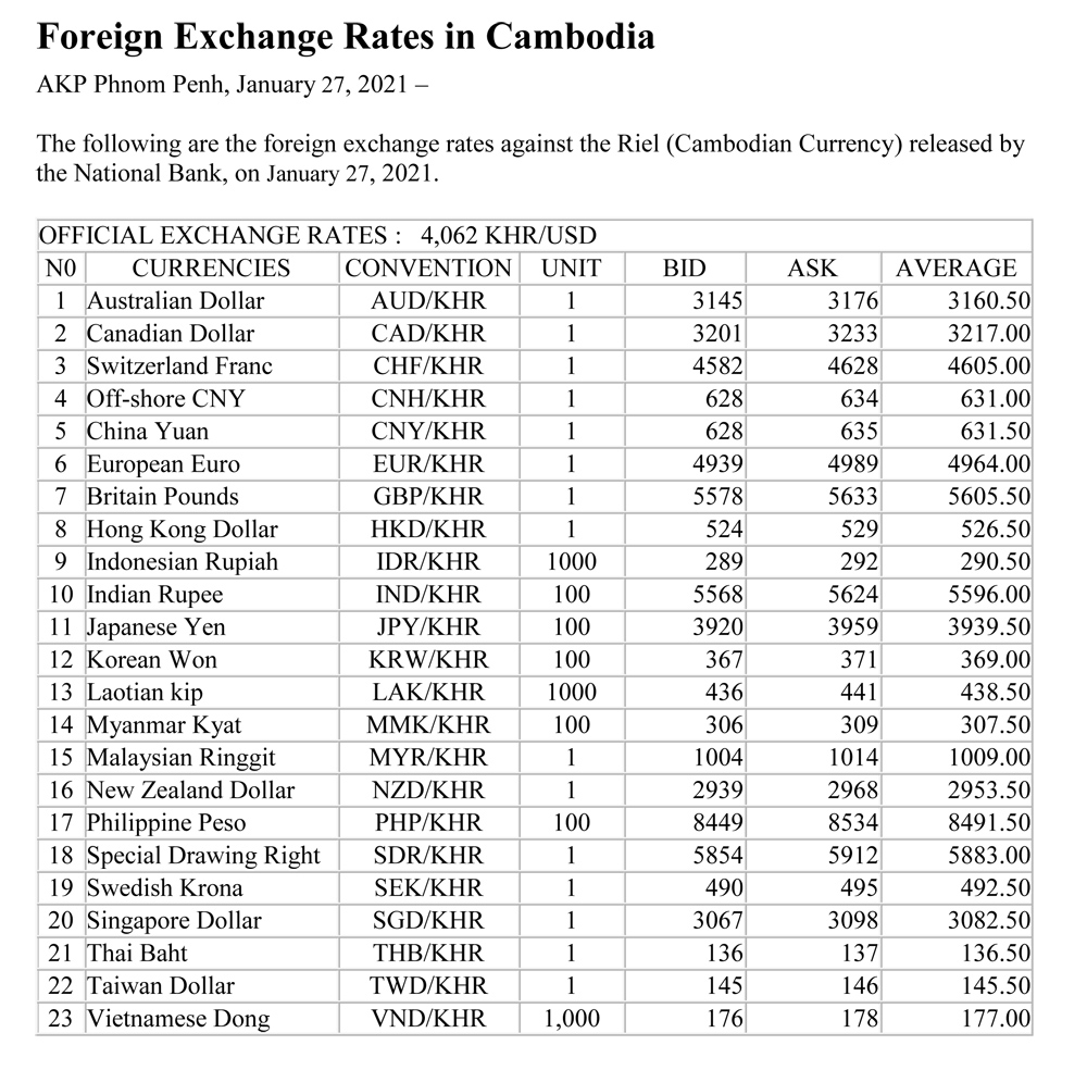 The following are the foreign exchange rates against the Riel (Cambodian Currency) released by the National Bank, on January 27, 2021.