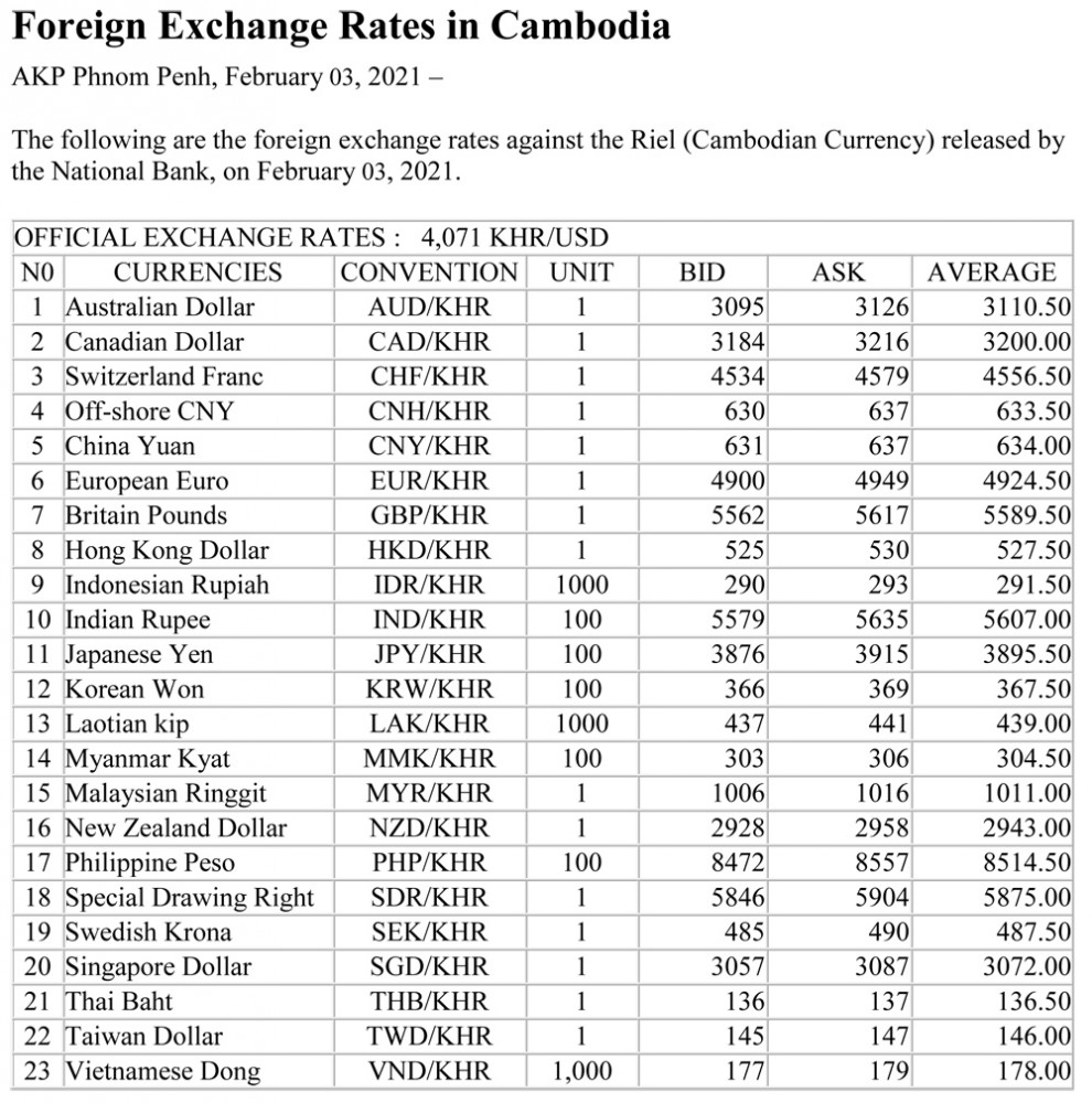 The following are the foreign exchange rates against the Riel (Cambodian Currency) released by the National Bank, on February 03, 2021.