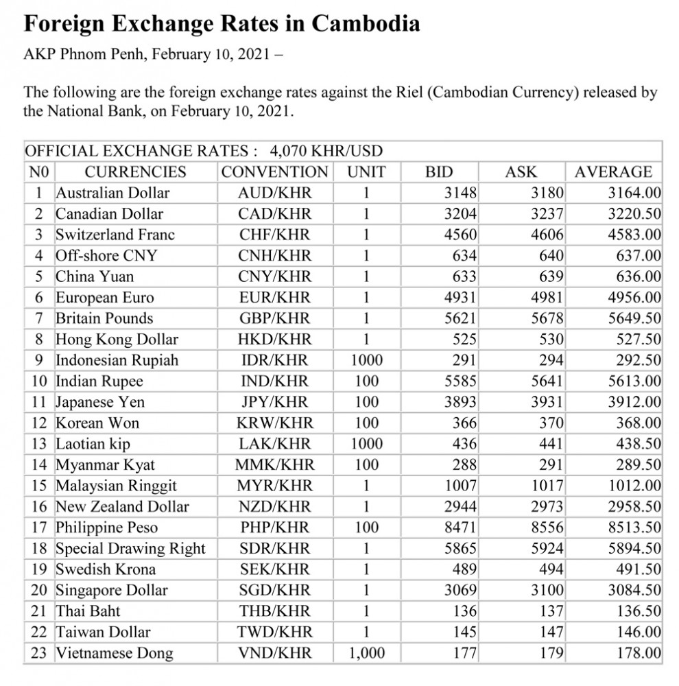 The following are the foreign exchange rates against the Riel (Cambodian Currency) released by the National Bank, on February 10, 2021.