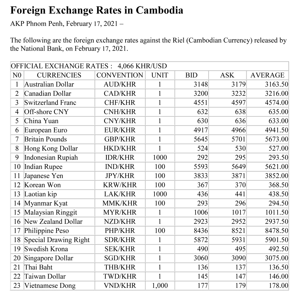 The following are the foreign exchange rates against the Riel (Cambodian Currency) released by the National Bank, on February 17, 2021.