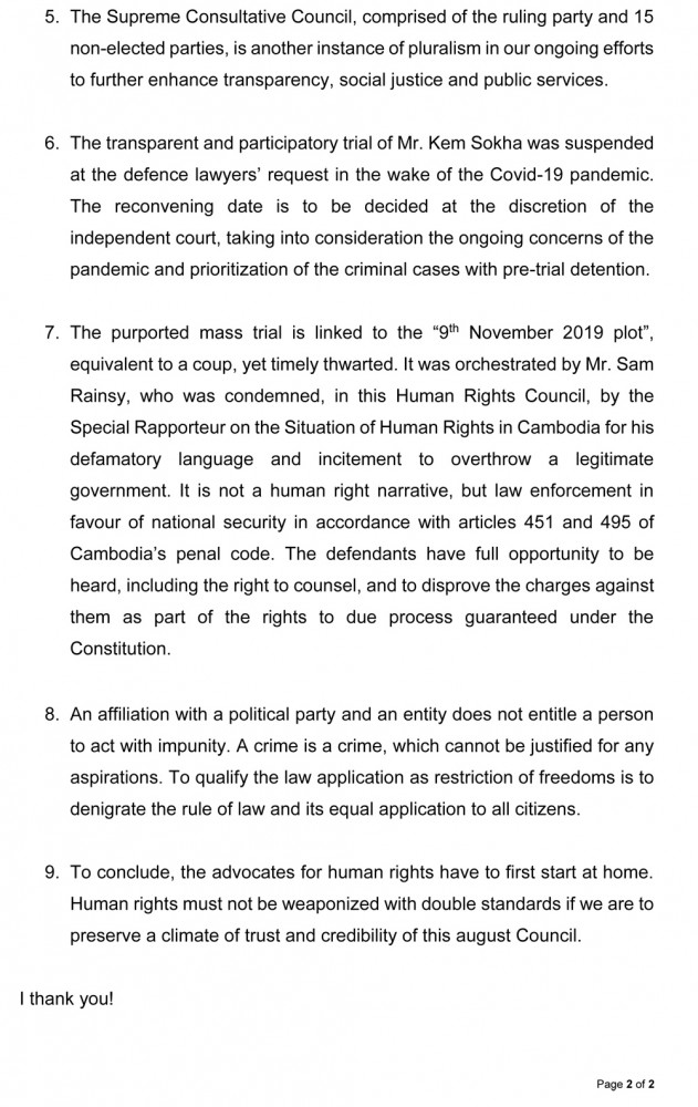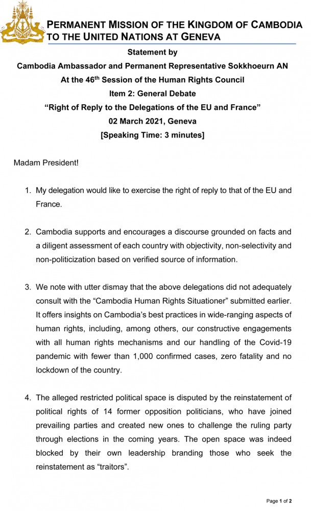 The comments were made by Ambassador and Permanent Representative of the Kingdom of Cambodia to the UN Office at Geneva H.E. An Sokkhoeurn in his statement in reply to the delegations of the EU and France, at the 46th Session of the Human Rights Council in Geneva on Mar. 2.