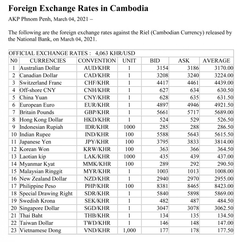 The following are the foreign exchange rates against the Riel (Cambodian Currency) released by the National Bank, on March 04, 2021.