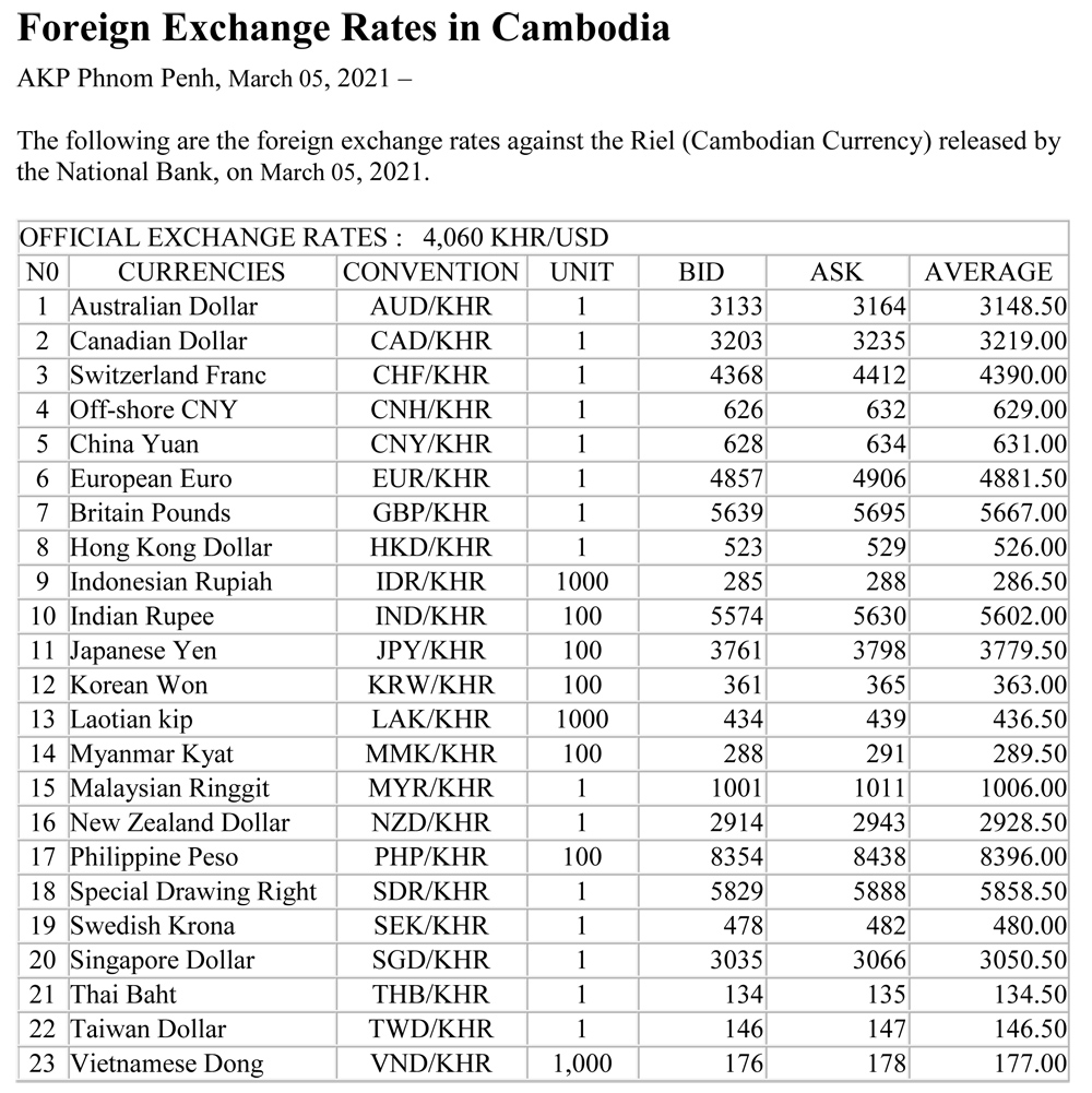 The following are the foreign exchange rates against the Riel (Cambodian Currency) released by the National Bank, on March 05, 2021.