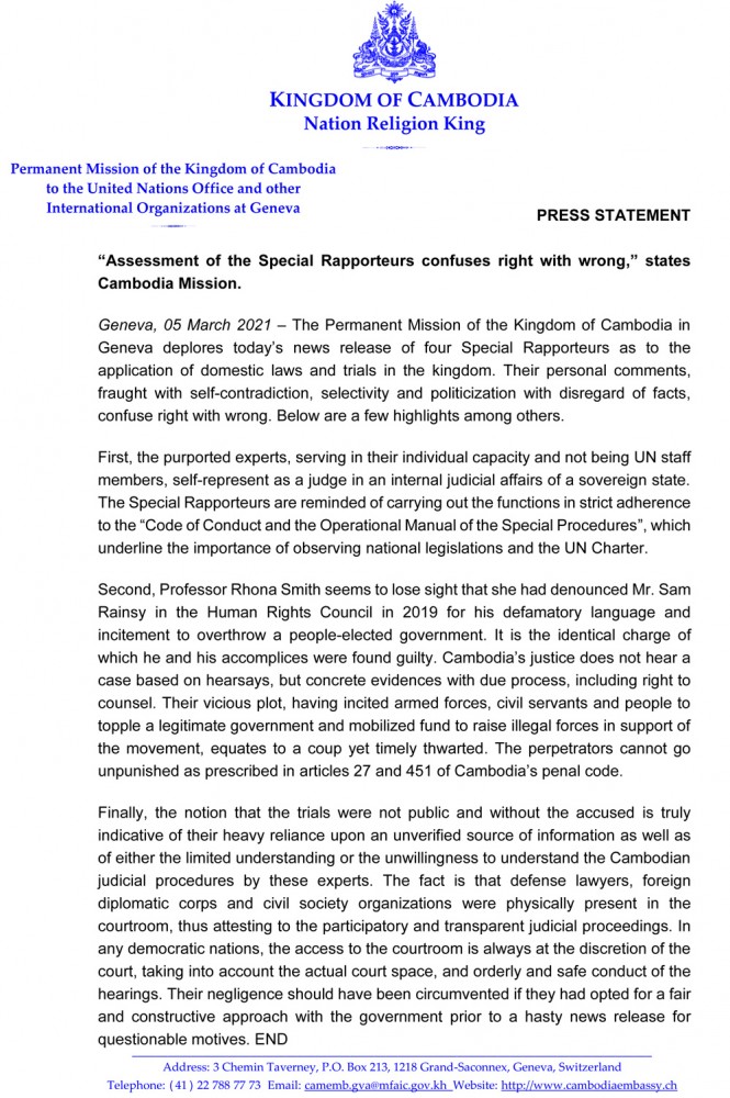 "Assessment of the Special Rapporteurs confuses right with wrong," states Ambassador and Permanent Representative of the Kingdom of Cambodia to the UN Office at Geneva H.E. An Sokkhoeurn on Mar. 5.