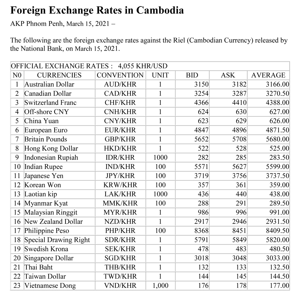 The following are the foreign exchange rates against the Riel (Cambodian Currency) released by the National Bank, on March 15, 2021.