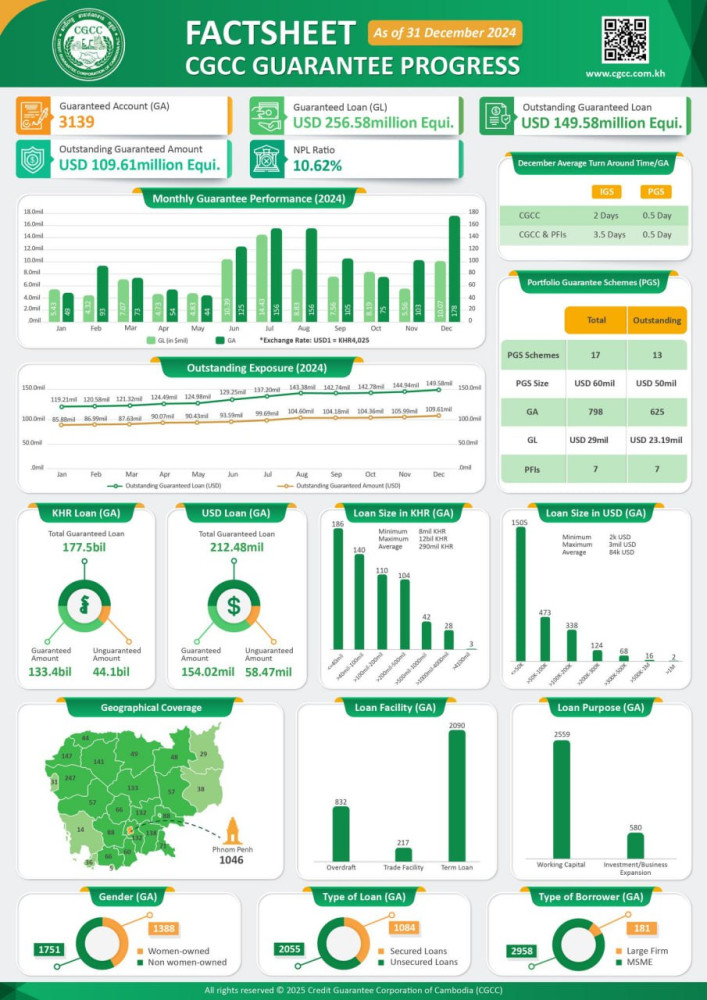 The Credit Guarantee Corporation of Cambodia (CGCC) has provided credit guarantees of US$256 million for micro, small and medium-sized enterprises (MSMEs) as of the end of December 2024 as their working capital for expansion.