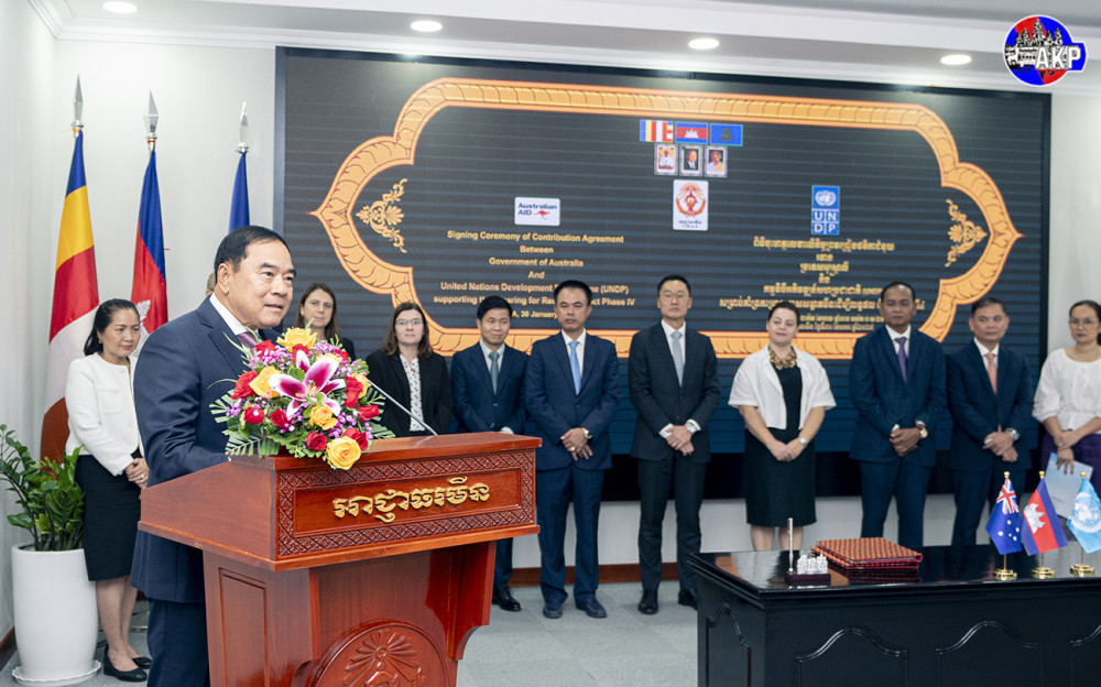 Senior Minister and First Vice President of the Cambodian Mine Action and Victim Assistance Authority H.E. Ly Thuch (Pic. 1) delivers his remarks while he was presiding over the signing ceremony of Contribution Agreement Supporting the Clearing for Results Project Phase IV between Australian Ambassador to Cambodia H.E. Derek Yip and UNDP Resident Representative Ms. Alissar Chaker, at the CMAA headquarters in Phnom Penh this afternoon.