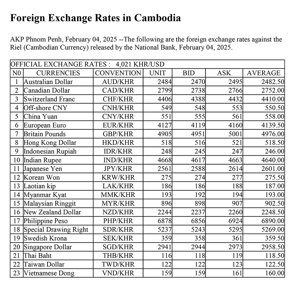 AKP Phnom Penh, February 04, 2025 --The following are the foreign exchange rates against the Riel (Cambodian Currency) released by the National Bank, February 04, 2025.