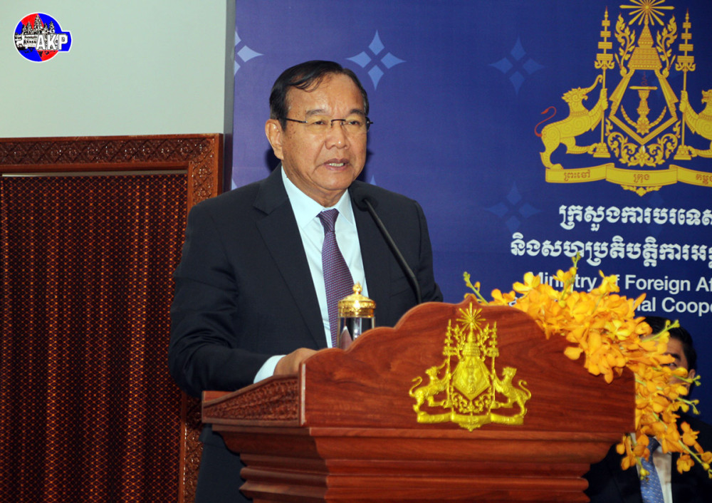 H.E. Prak Sokhonn (Pic. 1), Deputy Prime Minister and Minister of Foreign Affairs and International Cooperation, delivers his remarks while he was presiding over here this morning the opening ceremony of the annual meeting of the Ministry of Foreign Affairs and International Cooperation to review its work achievements in 2024 and set forth new direction for 2025.