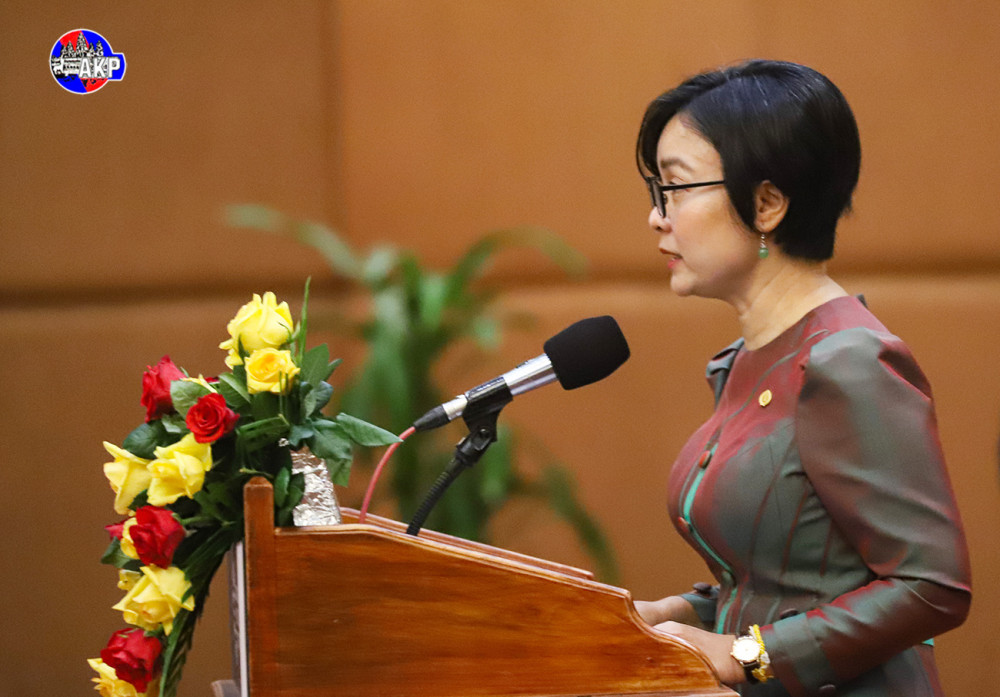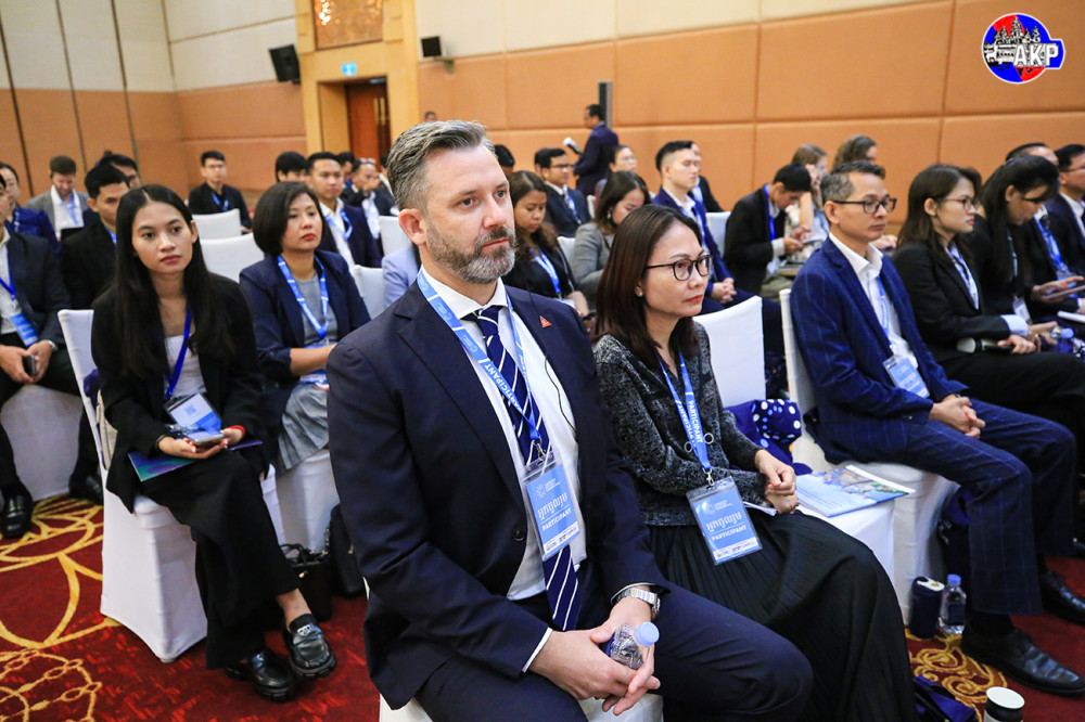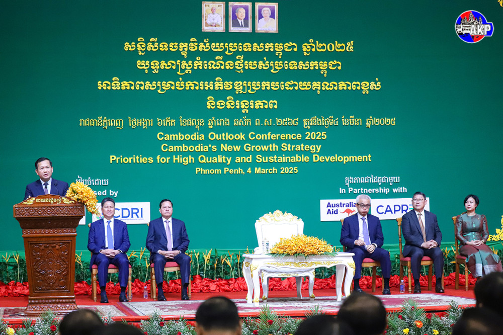 Samdech Moha Borvor Thipadei Hun Manet (Pic. 1), Prime Minister of the Kingdom of Cambodia, delivers his keynote remarks while he was presiding over the Opening Ceremony of the Cambodia Outlook Conference 2025 under the theme “Cambodia’s New Growth Strategy: Priorities for High Quality and Sustainable Development,” at Sokha Phnom Penh Hotel & Residence here this morning.