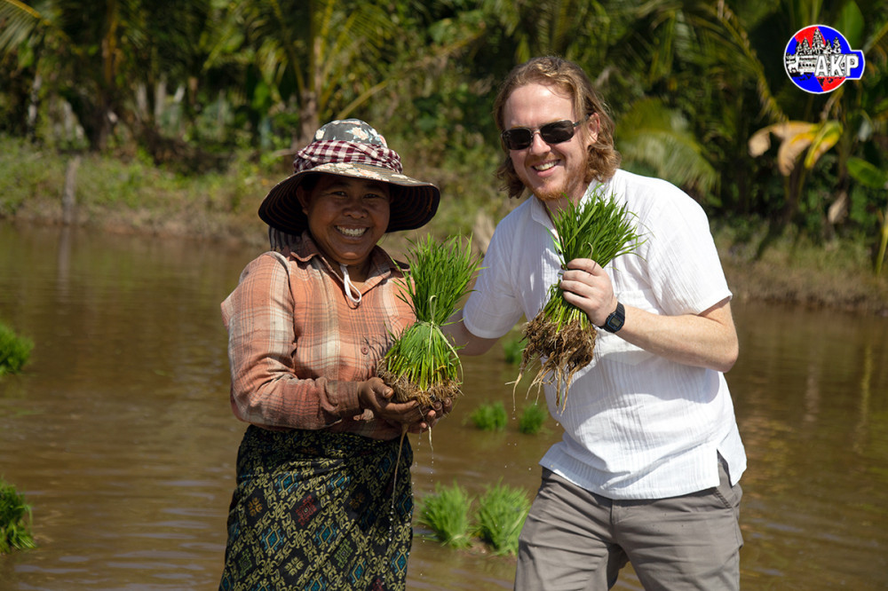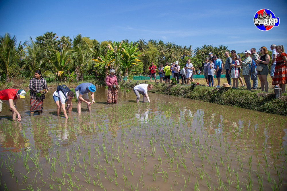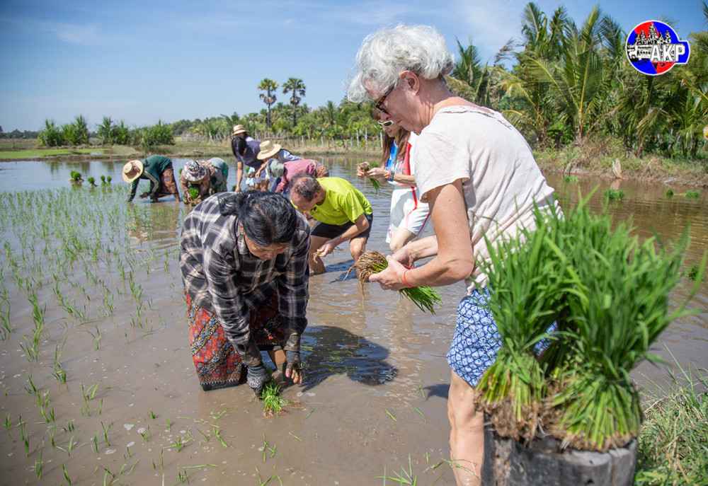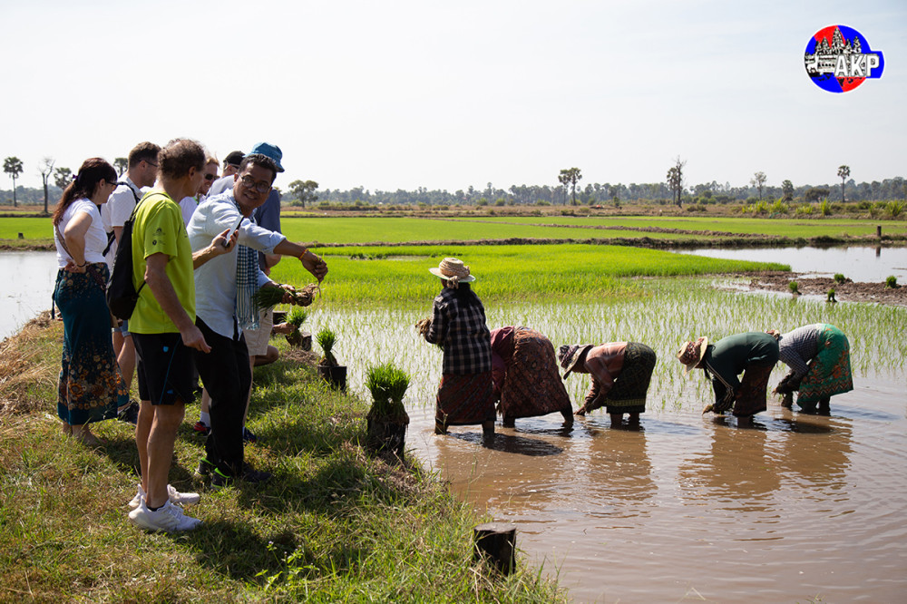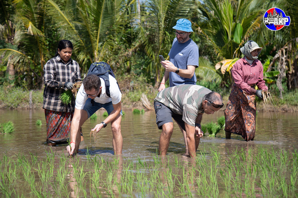 Foreign tourists joins farmers in Preah Dak commune, Banteay Srei district, Siem Reap province, in rice seedling transplanting and learn about rice growing.