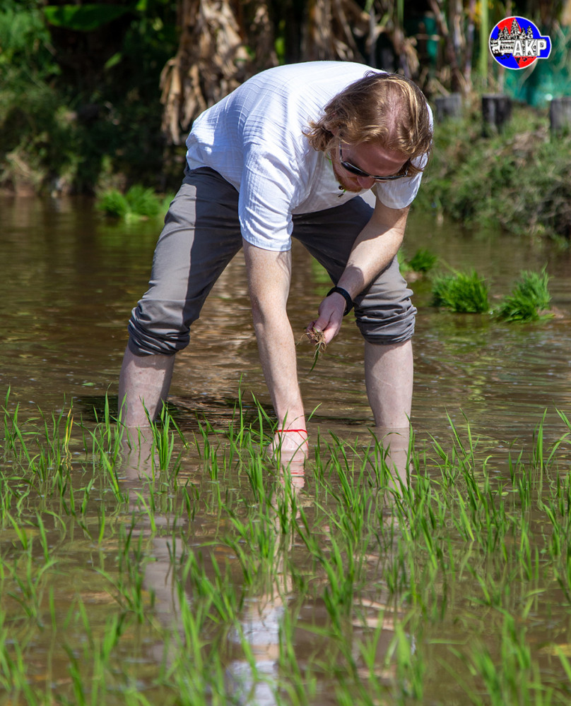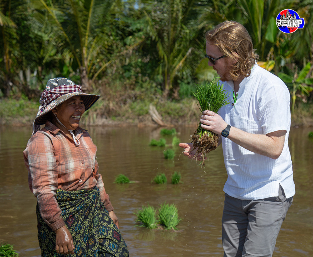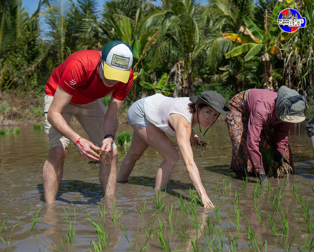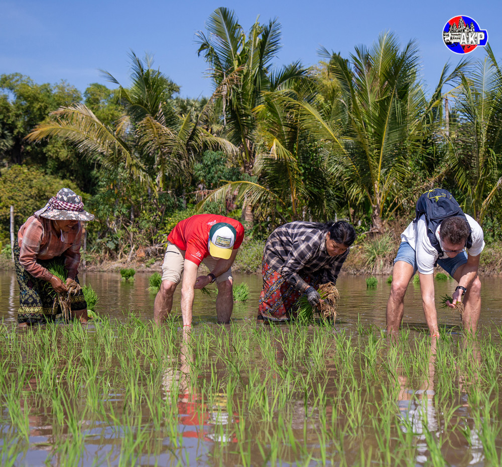 Foreign tourists joins farmers in Preah Dak commune, Banteay Srei district, Siem Reap province, in rice seedling transplanting and learn about rice growing.
