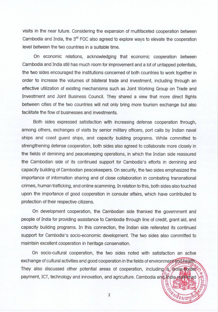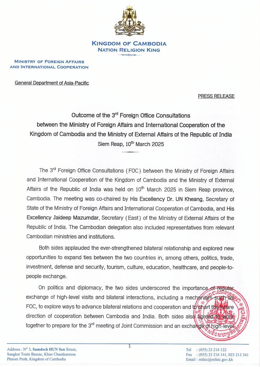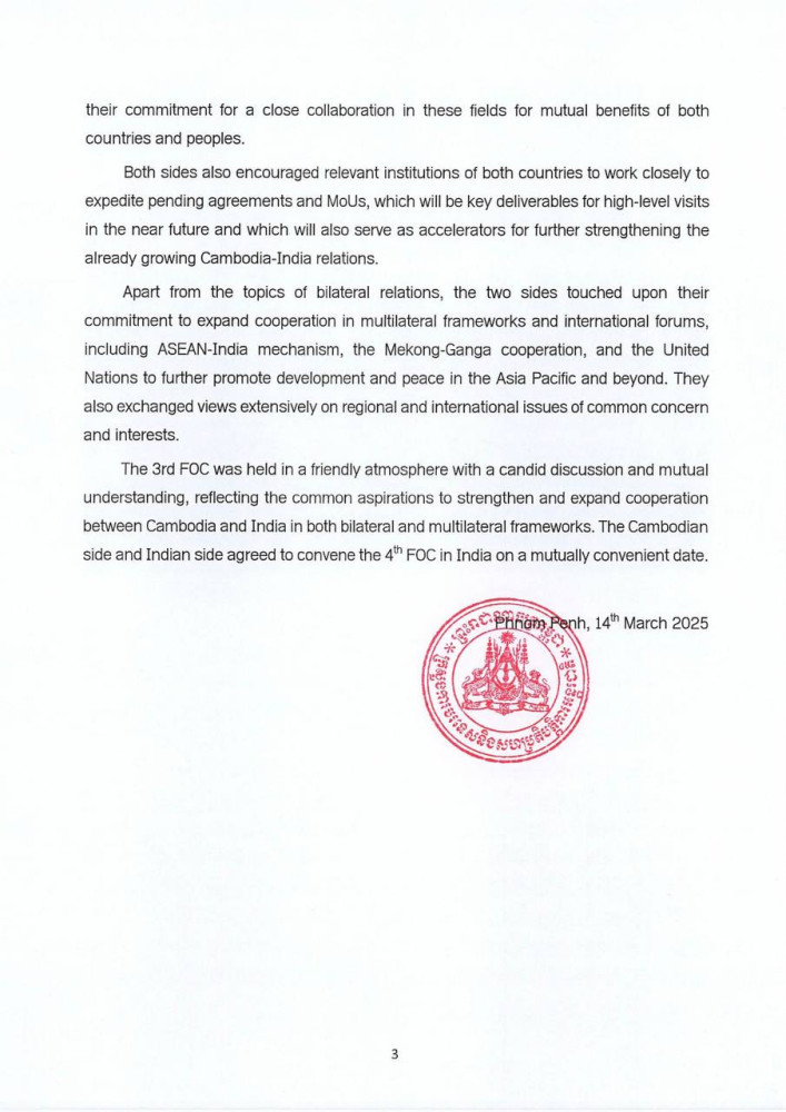The following are the outcomes of the 3rd Foreign Office Consultations between the Ministry of Foreign Affairs and International Cooperation of the Kingdom of Cambodia (MFAIC) and the Ministry of External Affairs of the Republic of India, released by the MFAIC this morning: